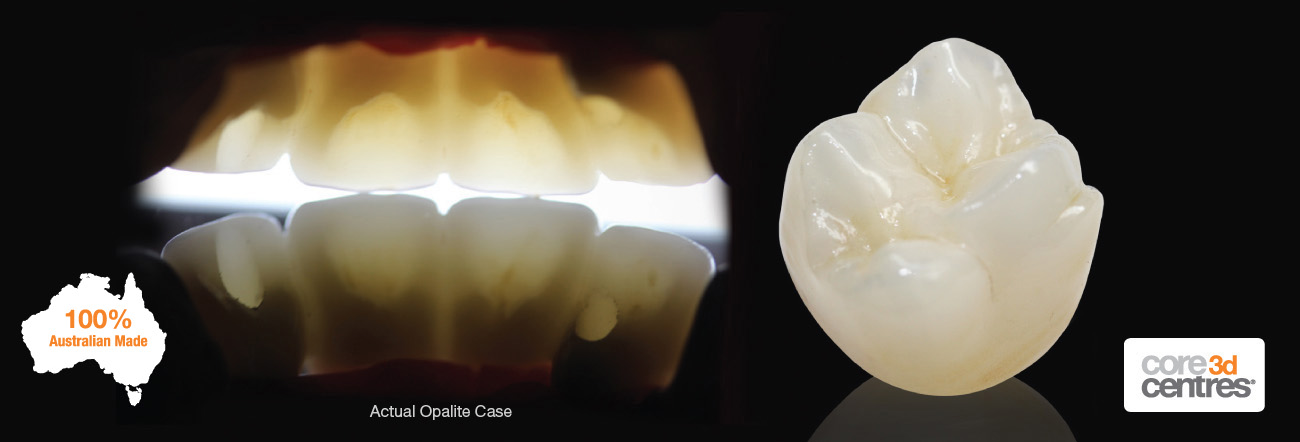 Opalite™ is monolithic zirconia and requires much less preparation space than traditional crowns, and is also far more aesthetic than traditional PFM restorations. Every dentist has experienced challenging situations with bruxers and grinders. With an exceptional flexural strength of 1100MPa Opalite™ restorations are virtually clinically unbreakable. Opalite™ all-zirconia crowns and bridges are designed digitally and milled from zirconia using CAD/CAM technology before being polished to a smooth finish with a similar lustre to a full gold crown for minimal abrasion.