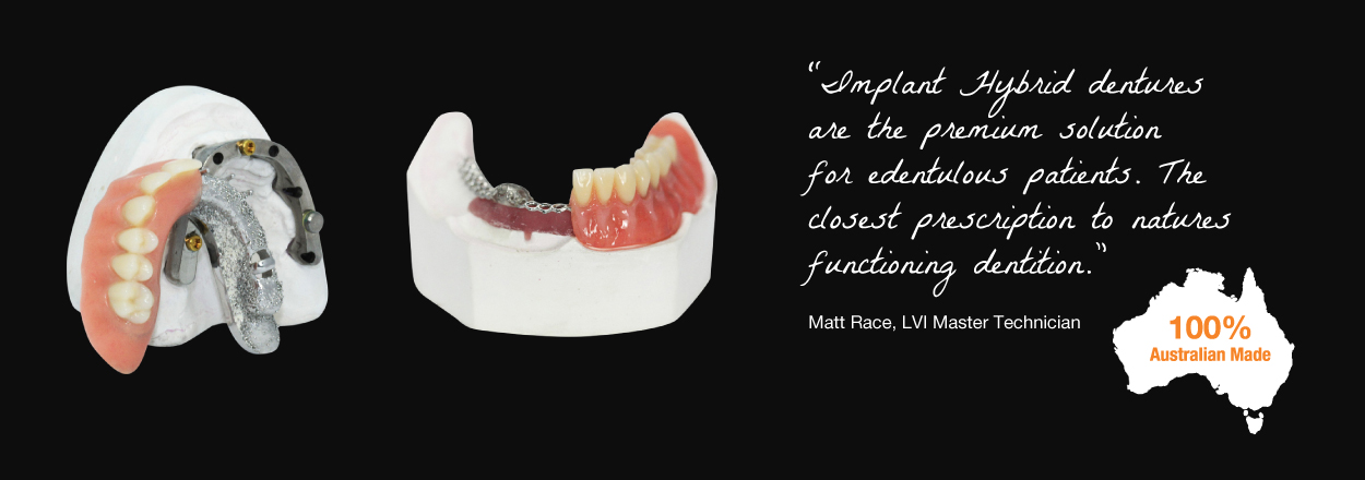 Fixed hybrid dentures are most popular in the maxillary region and provide outstanding aesthetics. They are fabricated using premium teeth, injection moulded acrylic for strength and aesthetics and come with all the relevant hardware necessary for placement. The internal frameworks are milled from Titanium, CoCr or Zirconia using industrial technologies.